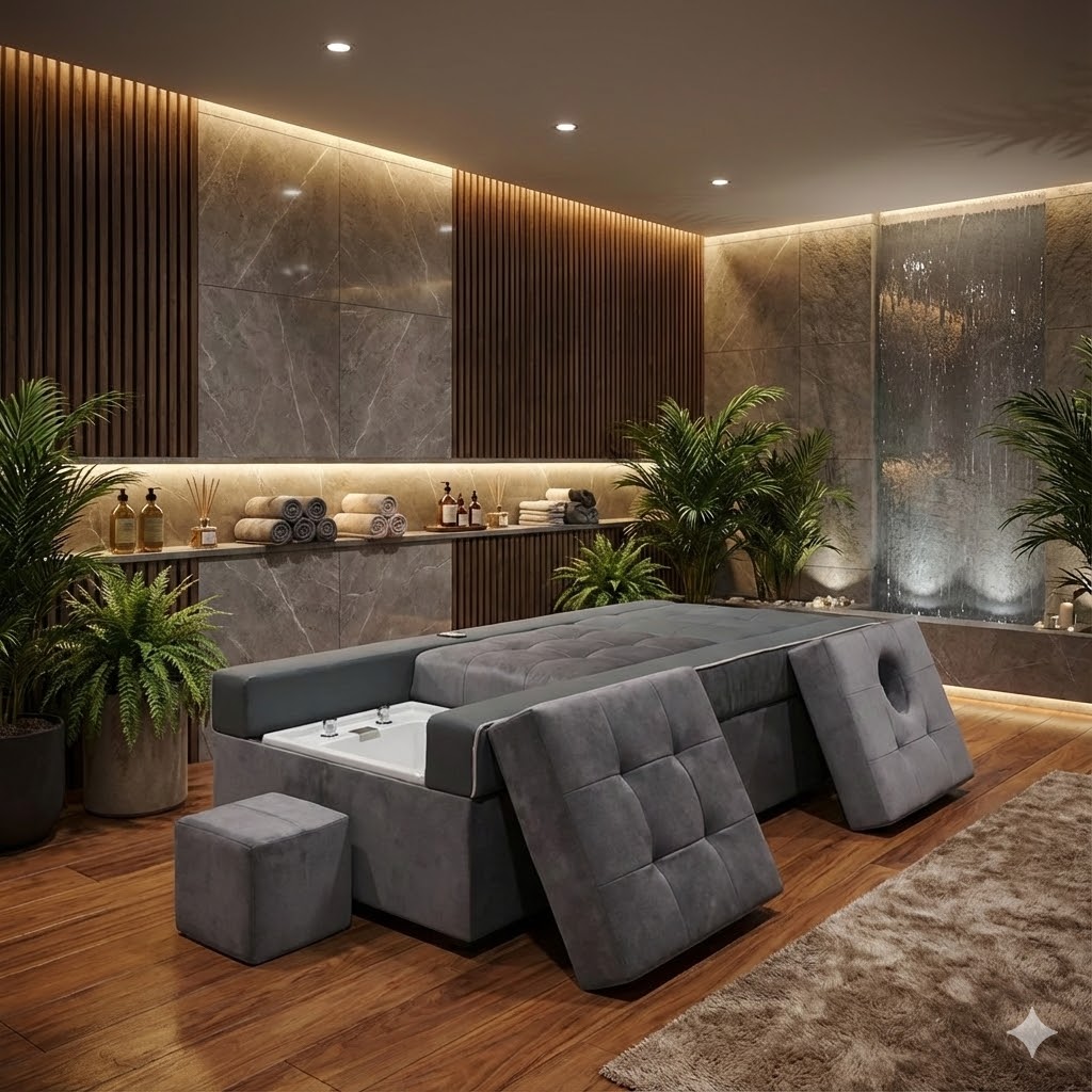 Tích hợp bồn ngâm chân + bồn gội đầu + giường massage, cho phép thực hiện nhiều liệu trình liên tục như ngâm chân, gội đầu dưỡng sinh, massage body mà không cần di chuyển khách.