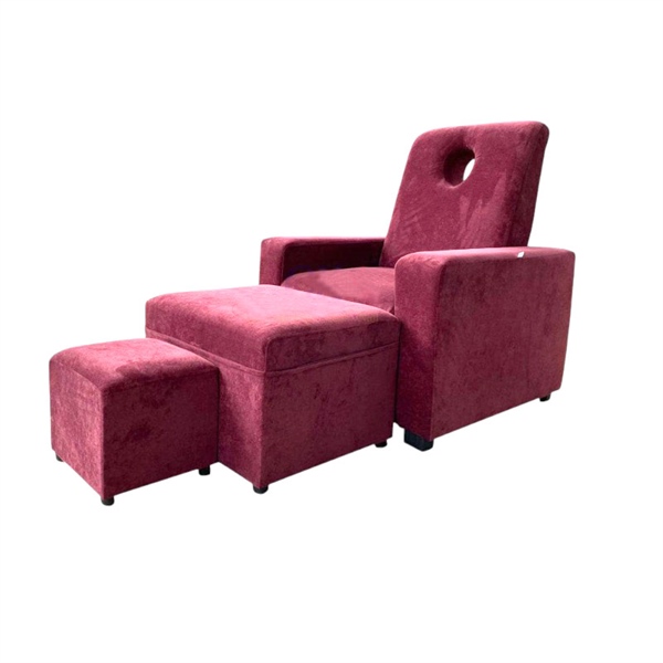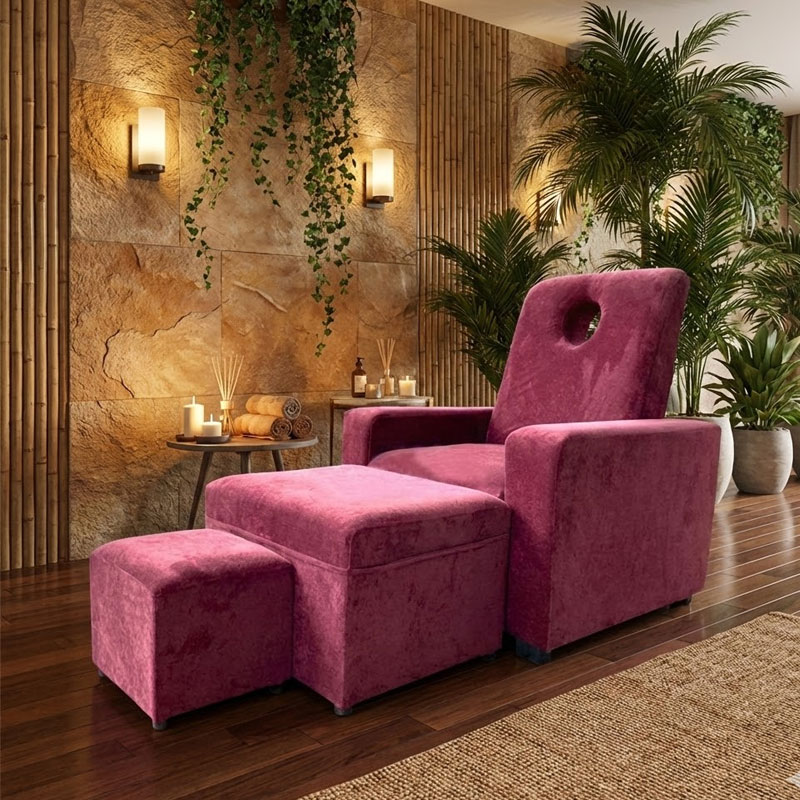 Bề mặt ghế được bọc vải nhung cao cấp, mềm mịn và dễ chịu khi tiếp xúc với da. Lớp đệm mút dày dặn, đàn hồi tốt giúp nâng đỡ cơ thể hiệu quả, mang lại cảm giác êm ái suốt quá trình sử dụng, đặc biệt phù hợp cho các liệu trình thư giãn kéo dài.